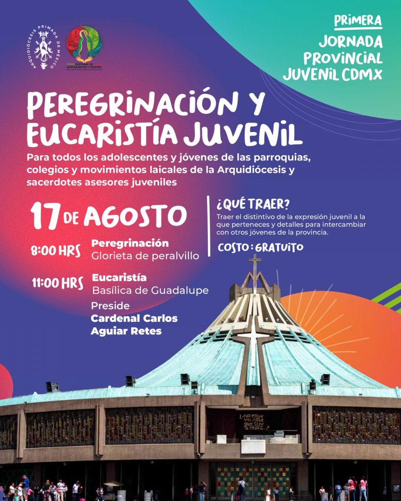 - 8:30 Peregrinación Juvenil a Basílica de Guadalupe: No es necesario registrarse para participar y es gratuito. Es recomendable llevar el distintivo de la expresión juvenil a la que pertenecen (playera, bandera, banderín, estandarte, pañoleta, etc.), así como detalles para intercambiar con otros jóvenes de la Provincia (pulseras, pines, calcomanías, estampas, etc.)