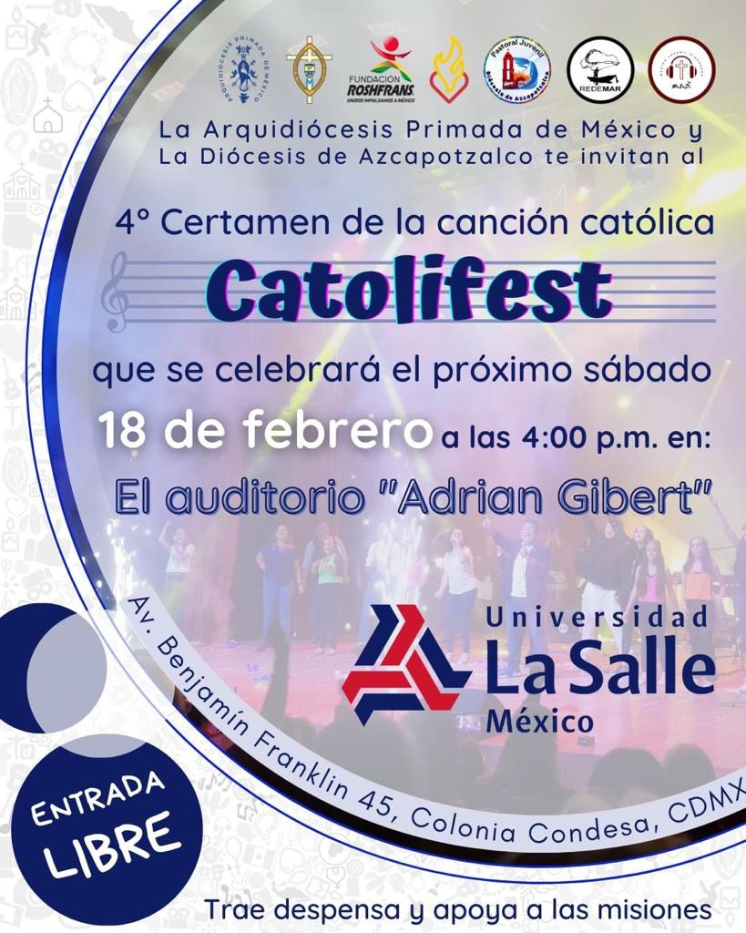 Te invitamos a participar en el 4to. Certamen de la canción Católica CATOLIFEST que se celebrará el 18 de febrero a las 4:00 p.m. en el Auditorio “Adrian Gilbert” en la Universidad La Salle México. La entrada es GRATUITA.