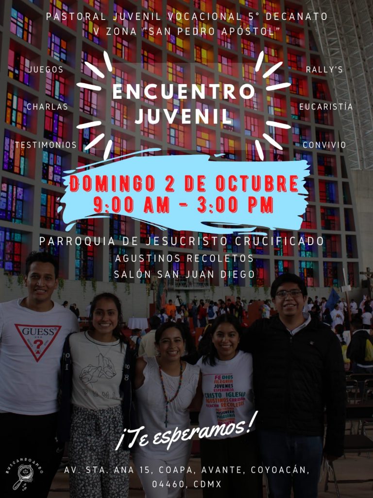 La Pastoral Juvenil Vocacional del 5to. decanato de la V Zona Pastoral “San Pedro Apóstol” te invita a participar en el Encuentro Juvenil en donde habrá juegos, charlas, testimonios, Rally´s, Eucaristía, convivio y mucho más.