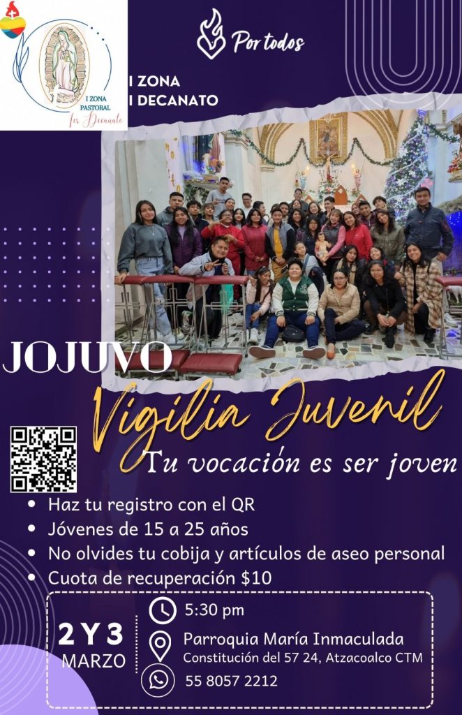 Como parte de las actividades de este semestre, el Primer Decanato de la Primera Vicaria te invita a su Jornada Juvenil Vocacional.