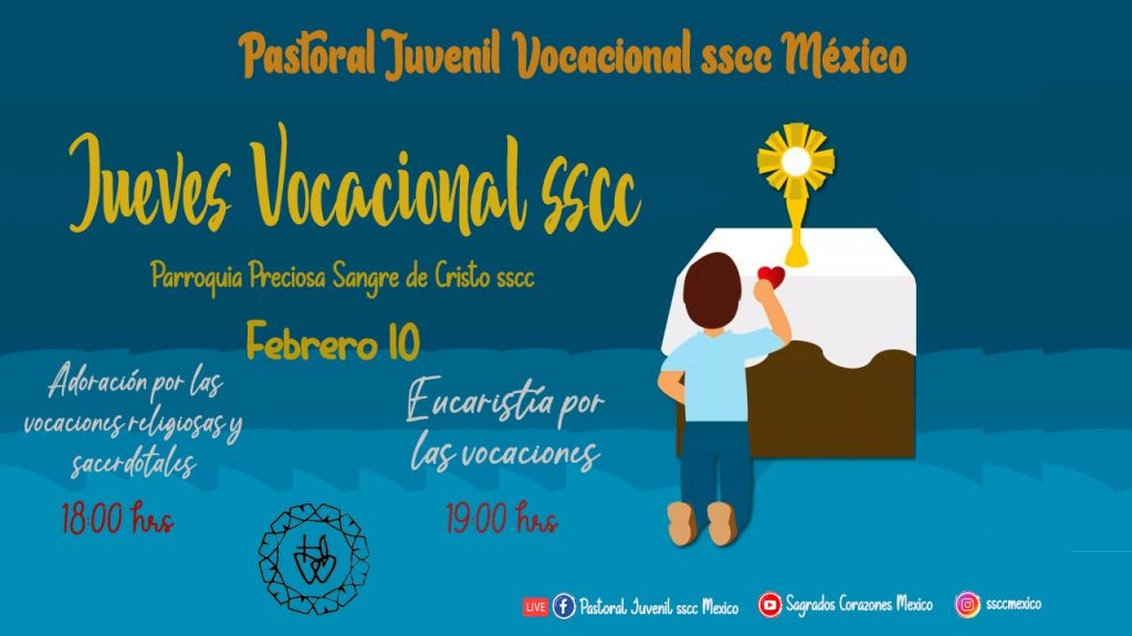La Pastoral Juvenil Vocacional sscc México te invita a vivir el jueves vocacional, en el cual habrá una adoración por las vocaciones religiosas y sacerdotales y una Eucaristía por las vocaciones.