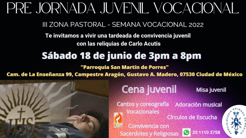 La III Zona Pastoral te invita a participar en la Pre Jornada Juvenil Vocacional, la cual será una tardeada de convivencia juvenil con las reliquias de Carlos Acutis. Se tendrán las siguientes actividades: cena juvenil, misa juvenil, cantos, coreografías vocacionales, adoración musical, círculos de escucha, convivencia con sacerdotes y religiosas y más.