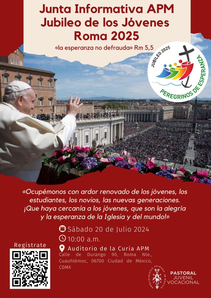 En esta ocasión, los invitamos a empezar a planear nuestra peregrinación hacia el Jubileo de los jóvenes a Roma 2025. Tenemos muchas noticias así que están súper invitados este próximo 20 de julio a las 10 am en el auditorio de la Curia. Calle Durango 90. Col Roma. En código QR pueden empezar a registrar su participación en la junta. ( Este no es el registro para el Jubileo solo para la junta o bien en el siguiente link). Nos saludamos pronto!!