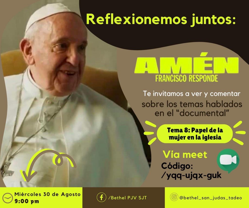 El grupo juvenil Bethel de la Parroquia San Judas Tadeo te invitamos a reflexionar juntos el documental “Amén Francisco responde”.