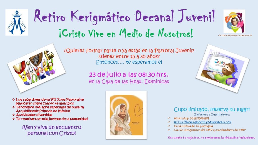 El 2do. decanato de la VII Zona Pastoral te invita a participar en el Retiro Kerigmático Decanal Juvenil, en donde habrá: sacerdotes de la zona pastoral que platicarán sobre cuánto te ama Dios, habrá invitados especiales de la Arquidiócesis Primada de México, actividades divertidas, conocerán a más jóvenes de la comunidad.