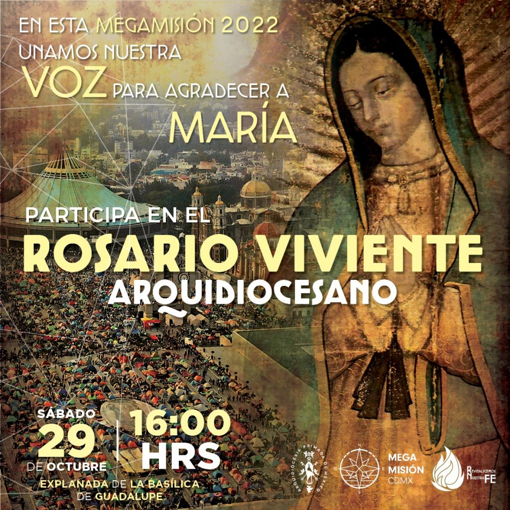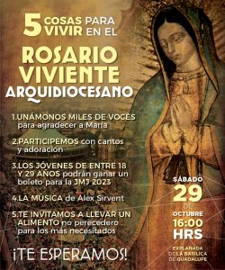 Te invitamos a participar en el Rosario Viviente Arquidiocesano, el cual se llevará a cabo el sábado 29 de octubre en un horario de 4:00 p.m. a 7:00 p.m. en la explanada de la Basílica de Guadalupe en donde habrá Adoración al Santísimo, cantos y mucho más. La entrada es GRATUITA.
