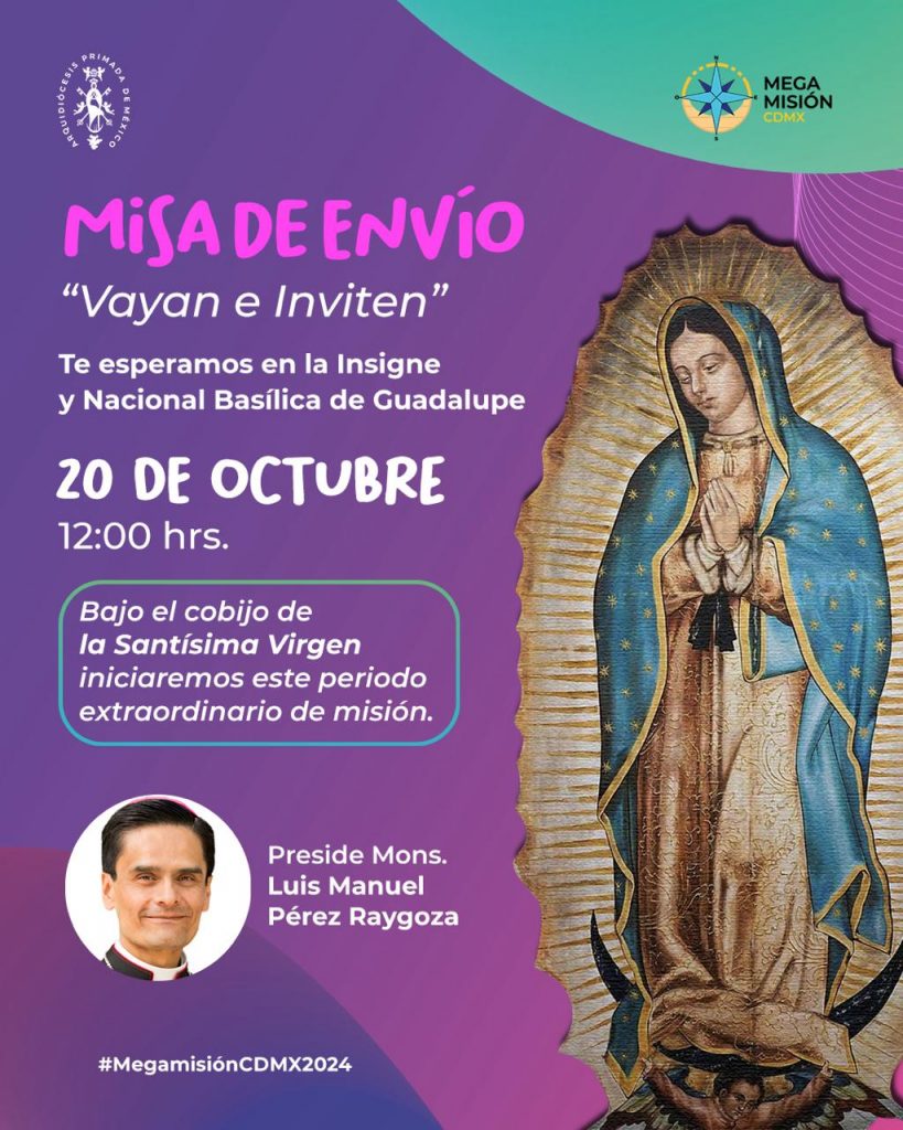 Te invitamos a participar en la Santa Misa de envío de la Megamisión, este 20 de octubre de 2024 en el Domingo Mundial de las Misiones, presidida por Monseñor Luis Manuel Pérez Raygoza, Obispo auxiliar de la Arquidiócesis Primada de México, a las 12:00 horas en la Insigne Nacional Basílica de Guadalupe. Encomendemos esta gran misión a Nuestra Madre María Santísima ¡VAYAN E INVITEN! #MegamisiónCDMX2024